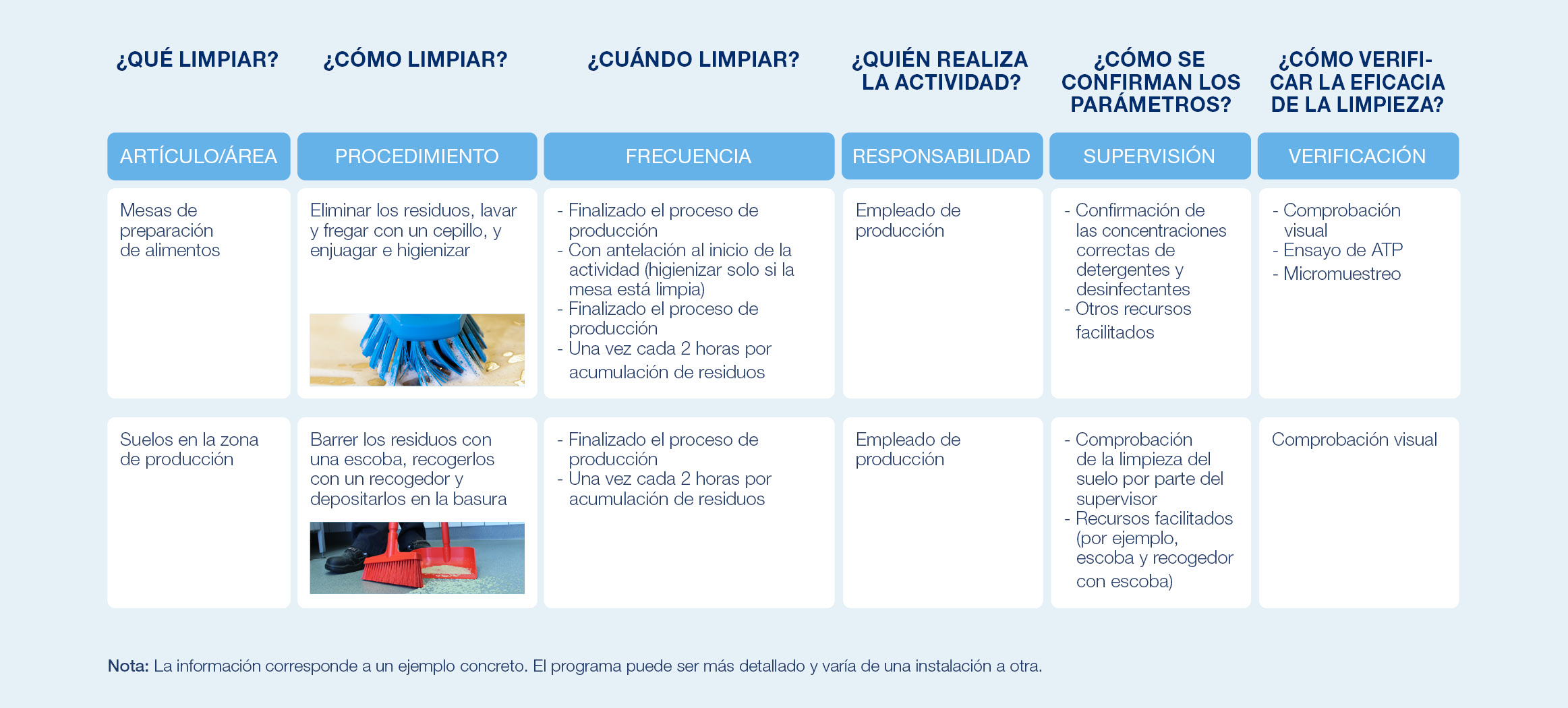 “Se implantarán y mantendrán procedimientos de limpieza y desinfección debidamente documentados para el edificio, la planta y todos los equipos. Los procedimientos de limpieza para los equipos de procesamiento y las superficies en contacto con alimentos incluirán, como mínimo: responsable de la limpieza; elemento/área a limpiar; frecuencia de limpieza; método de limpieza, incluido el desmontaje del equipo cuando sea necesario; sustancias químicas de limpieza y concentraciones; materiales de limpieza a usar; registros de limpieza (incluido registro de ejecución y visto bueno); y responsable de la verificación”.