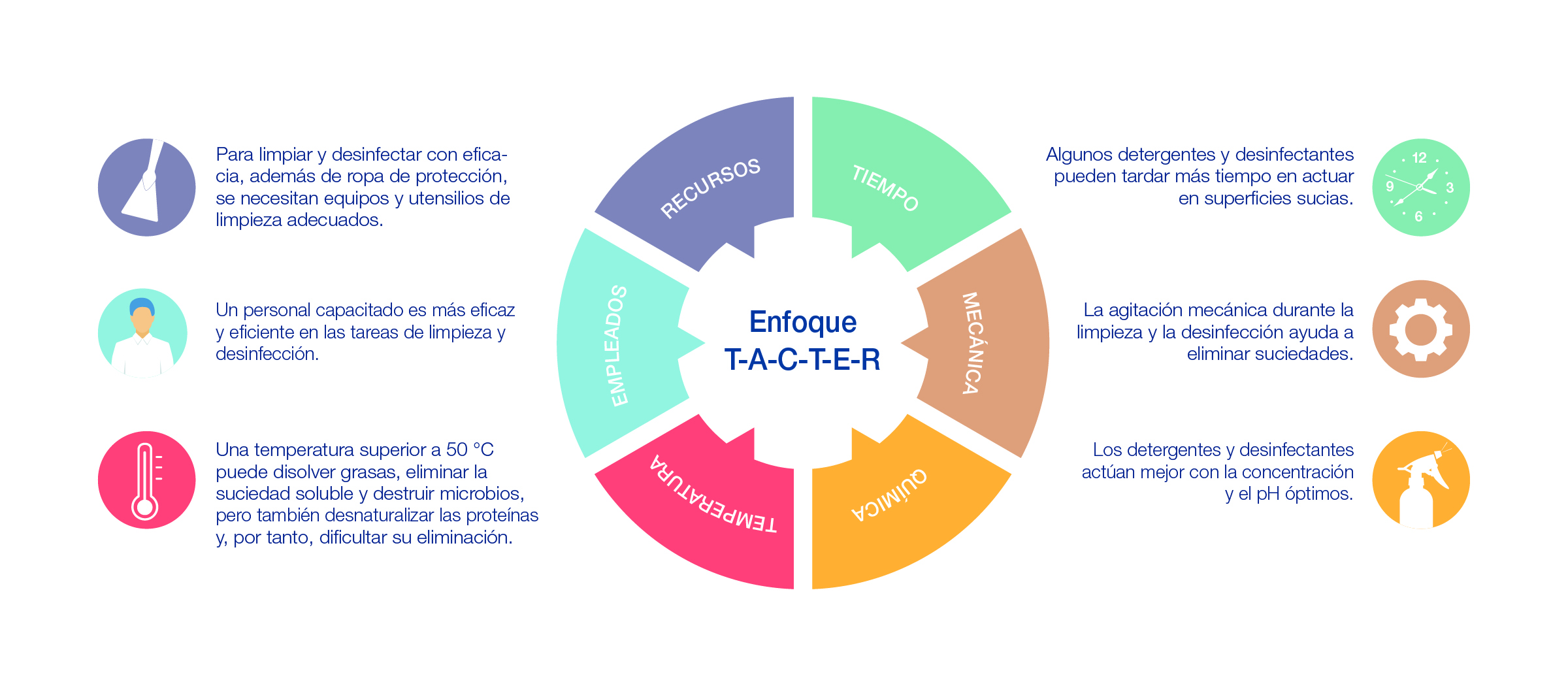 • Eduque y forme al personal para que pueda poner en marcha y mantener de forma eficaz y eficiente un programa de saneamiento en la planta. El personal deberá estar familiarizado con los parámetros fundamentales necesarios para eliminar la suciedad de una superficie, tal como se ilustra: