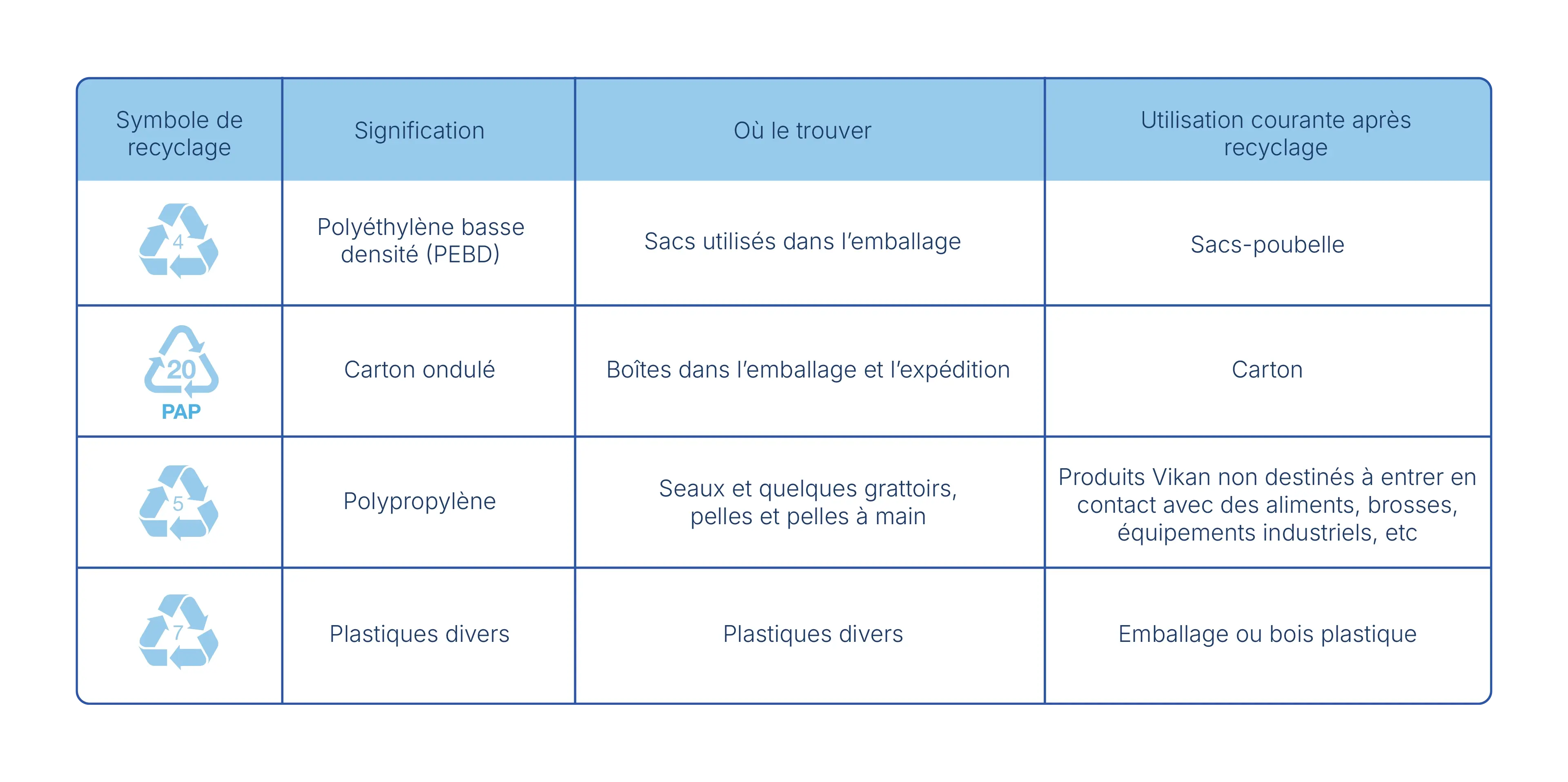 Ces symboles sont reconnus à l’échelle internationale et guident les consommateurs dans leurs efforts de recyclage. Vikan teste actuellement un « programme de reprise » dans le cadre duquel nous recyclons vos outils en fin de vie. Si vous souhaitez participer, veuillez contacter le service client ou votre représentant Vikan.