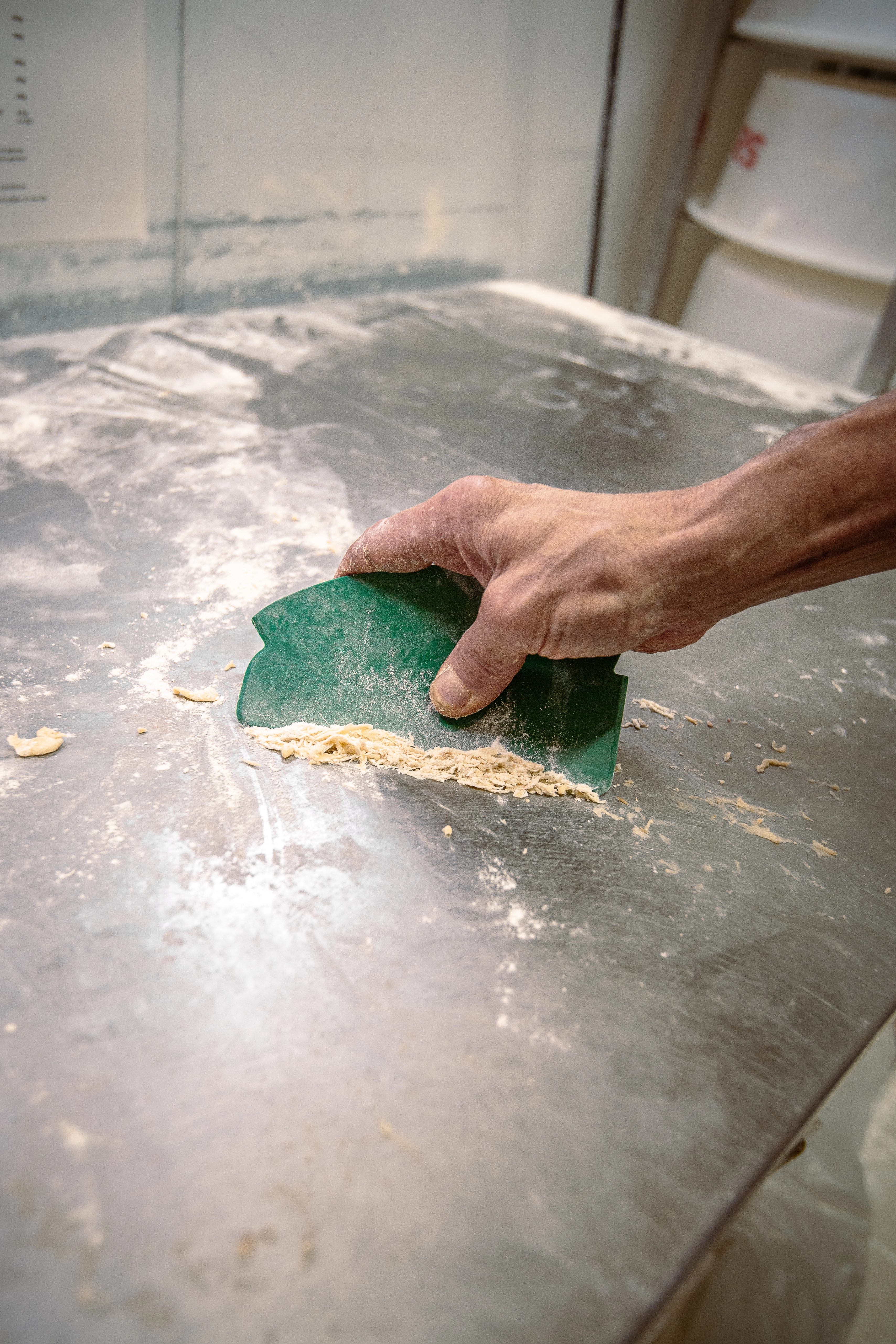 Bevelled scraping edge helps dislodge dried on materials