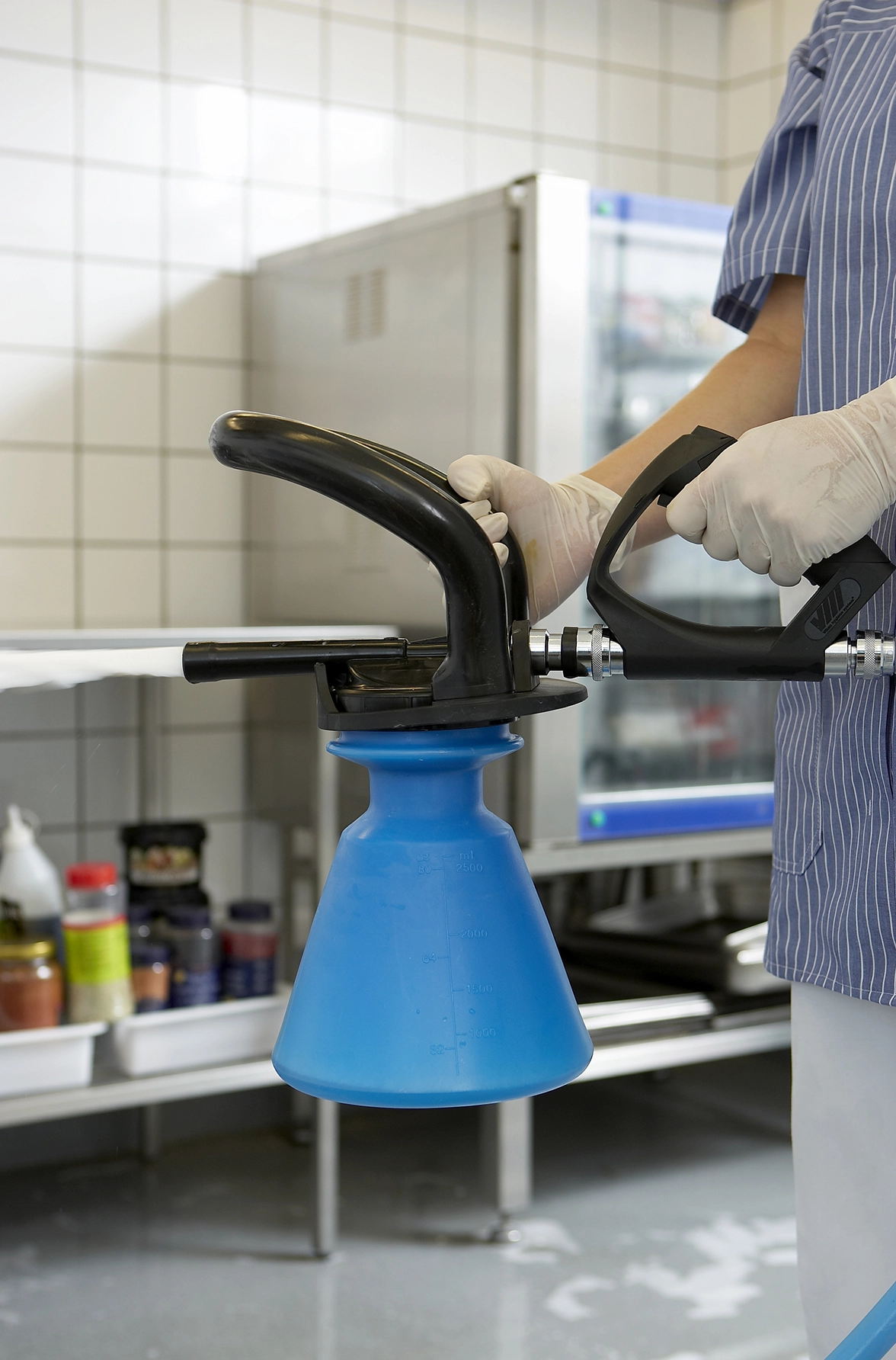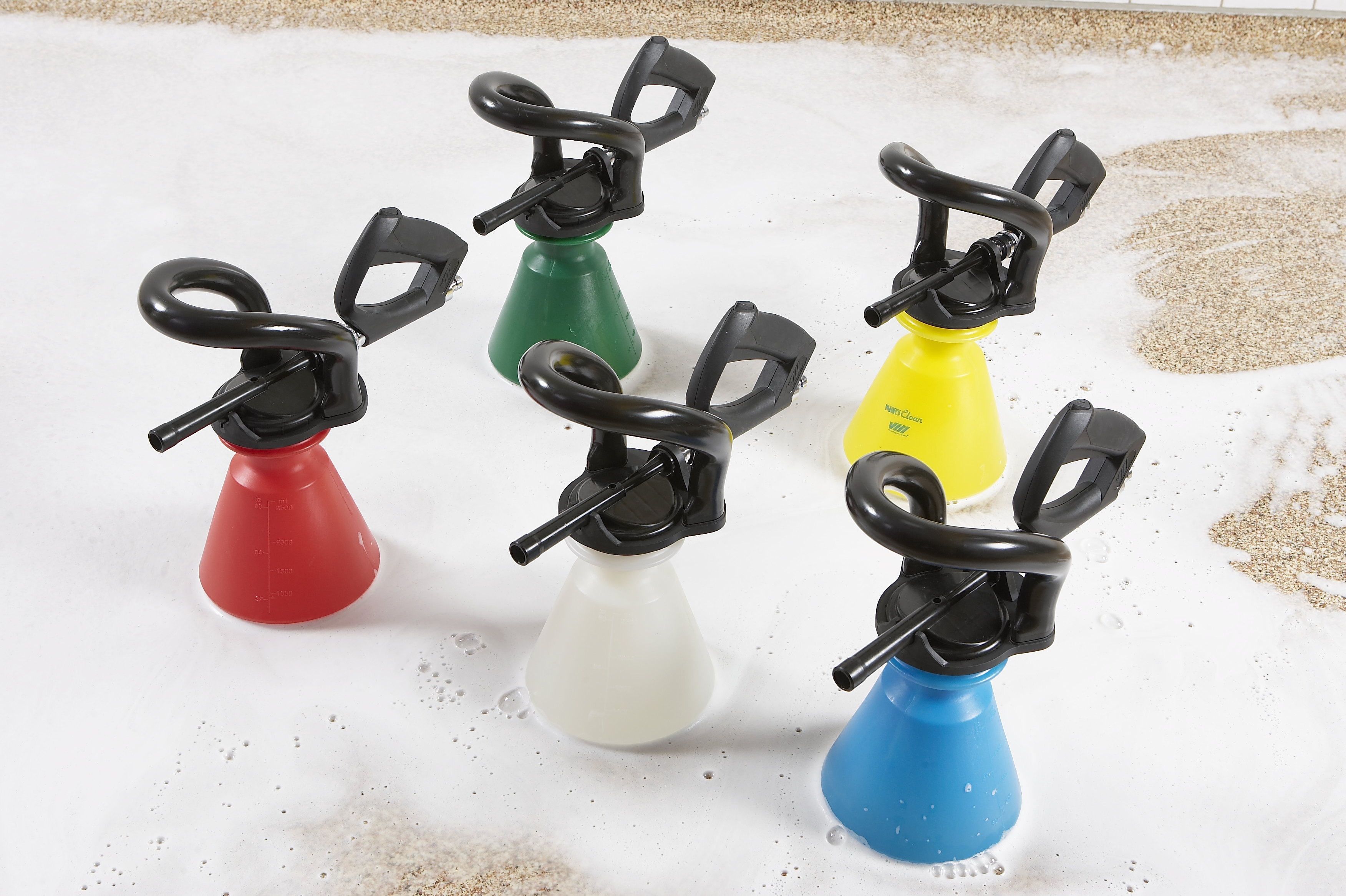 Easily tackle light-scale cleaning tasks with this set. Whether washing the floors in showers, fitness studios, pools, or more, it gets the job done with a constant chemical dosage (0.4-10%, depending on manufacturer’s recommendations). It can handle 2-8 bars of pressure and has an ergonomic grip that won’t slip, even when wet. Each version comes has a set of 15 colour-coded nozzles for different chemical concentrations included. The ergonomic grip makes the set easy to use - even when the container is filled with chemical. Never allow chemicals directly through the foaming gun.